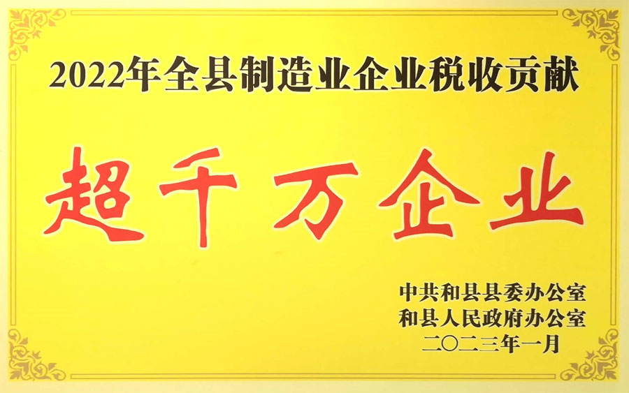 为弘扬先进、树立典型,和县县委、县政府决定对2022年度全县制造业企业税收贡献超千万元企业进行表彰,并在会上进行了通报,公司荣获“2022年度全县制造业企业税收贡献超千万元企业”荣誉称号。